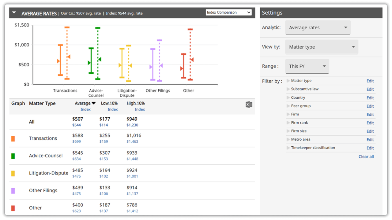 - Informed decision-making: Use advanced benchmarking to assess the impact of proposed rate increases, facilitating a clear assessment of their alignment with market trends and effect to overall legal spend.