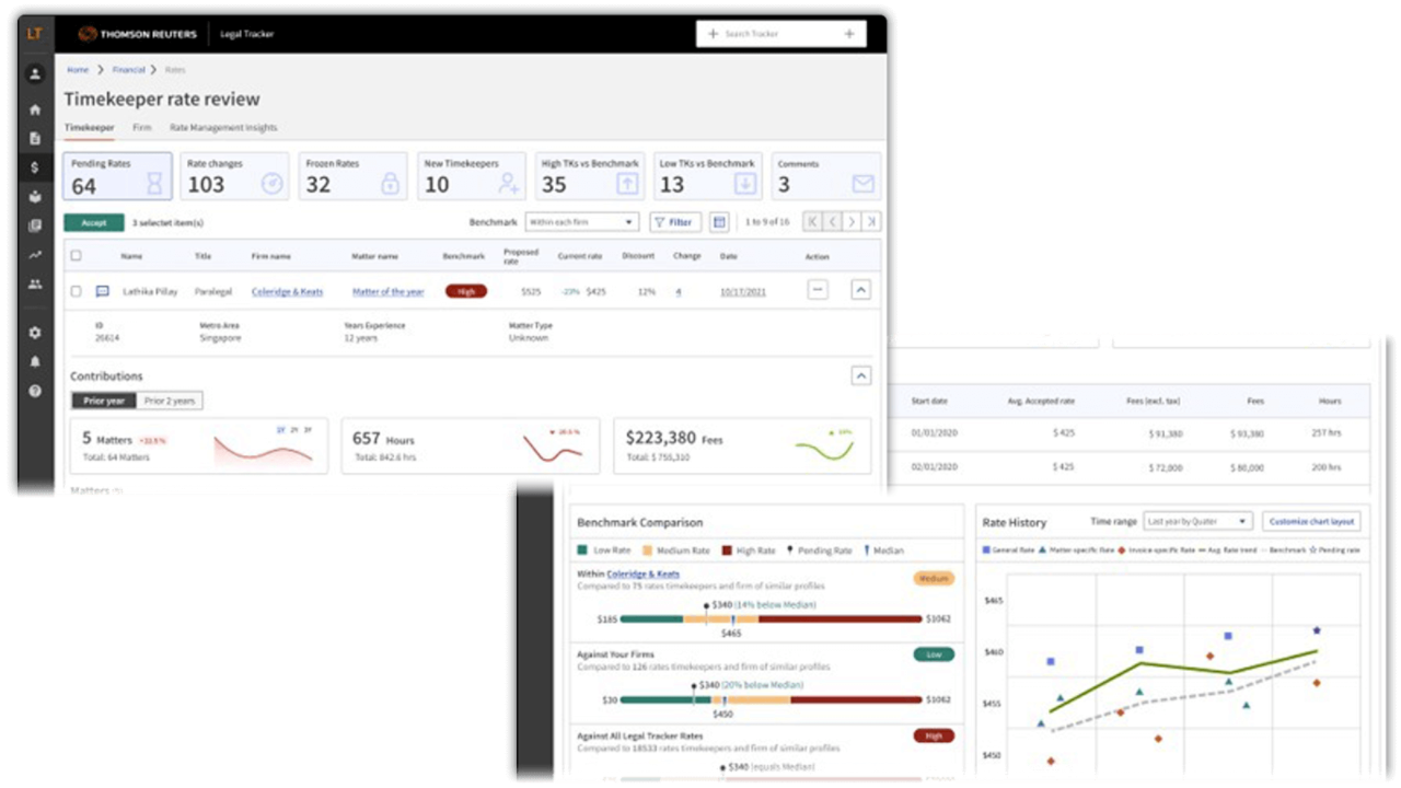 - Benchmark and analyse: Use enhanced tools to benchmark legal spend against industry, historical, and activity data, and quickly analyse rate increases by timekeeper and firm.